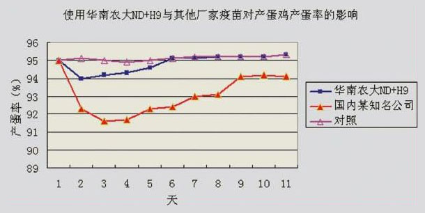 華南農業大學獸醫學院針對近年國內流行H9毒株和新城疫強毒作分析比較,挑選山東、河南、河北、廣西等 有代表性的禽流感H9N2病毒和新城疫強毒各近100株作為攻擊病毒,分別以上述病毒攻擊以用廣州市華南農大生物藥品有限公司精品系列油苗一ND+H9和國內其他廠家的疫苗免疫的試驗雞,計算發病雞數量,統計不同疫苗之間的保護率,發現廣州市華南農大生物藥品有限公司生產的精品系列油苗一ND+H9對上述攻擊野毒都有較好的保護作用。