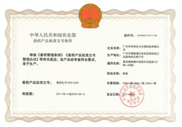 2017年8月14日,由華南農(nóng)業(yè)大學、中國獸醫(yī)藥品監(jiān)察所、廣州市華南農(nóng)大生物藥品有限公司(以下簡稱“華南生物”)共同研發(fā)的禽流感病毒H5亞型滅活疫苗(D7株+rD8株)通過農(nóng)業(yè)部獸藥產(chǎn)品批準文號的審批,喜獲得農(nóng)業(yè)部核發(fā)的獸藥產(chǎn)品批準文號——獸藥生字190912293;商品名:禽盾。
