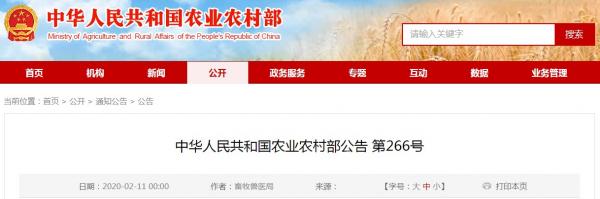 信息來源:中華人民共和國農業農村部公告 第266號