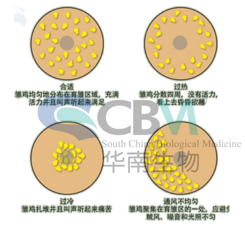 在實際飼養過程中。要根據情況看雞施溫。判定溫度是否適宜還要取決于雞群狀態。在正確的溫度下雞群散開,雛雞一般20—30只為一個群體,且不同群體間的雛雞相互運動,叫聲清脆。溫度過高,雛雞沒有叫聲,張口喘氣,頭和翅膀下垂,遠離熱源。溫度過低,雛雞在靠近熱源處扎堆,發生悲鳴的叫聲。賊風、光照不均、外界噪音也會引起扎堆情況,要認真觀察,加以區分。