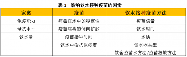 飲水接種疫苗的原則是向所有的家禽至少提供最小保護劑量的活疫苗,同時需防止現(xiàn)場野毒在家禽中擴散。因此,飲水接種疫苗的效果取決于多種與保持疫苗活性相關的因素、飲水接種操作方法和家禽健康情況三大類。具體見表1所示,忽略一個小細節(jié),都有可能致使疫苗免疫失敗。