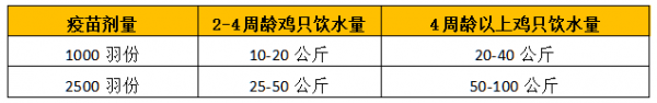 溶解疫苗所需的水量根據(jù)雞群日飲水量而定,大致的標準是:全天飲水量的1/5-2/5,如果是考慮肉雞或天氣炎熱時,飲水量可增加5~10%(參考下表)