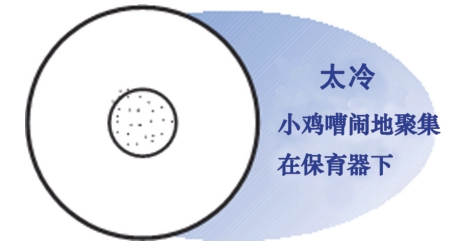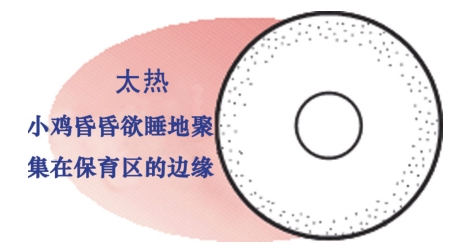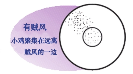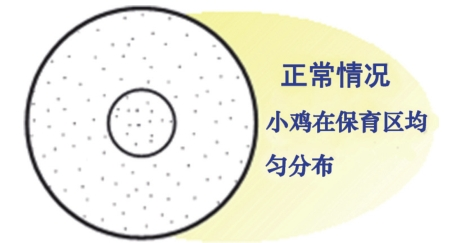 (3)雞舍內的溫度要保持均衡和穩定,避免溫度忽高忽低和雞舍兩端溫差過大,檢查溫度是否合適的最佳方法,是觀察雞苗的分布狀態及活動表現(如下圖,中間小圓圈為加熱器)。